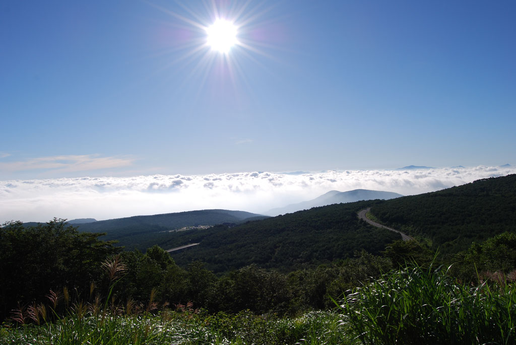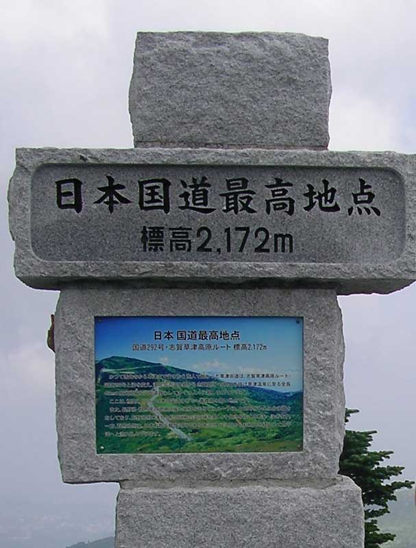 さて何が日本一?・・・ 高さです。海面からの高さが日本一の国道です。 草津から志賀高原を経て長野に抜ける道。 これは国道らしい(ヲイ!)ですが、この道を登りきった付近に標識がありました。 へえ・・・そうなんだ・・・ って感じでちょっと停まって通り過ぎてしまうポイントですが、とりあえず日本一ということで。 もう一枚は、そこから見た風景写真です。右奥の街並みは草津温泉街と思います。 この道を更に先に進むと、もう一つの日本一があります。結構有名なので、知っている人も多いと思います。明日、紹介します。
