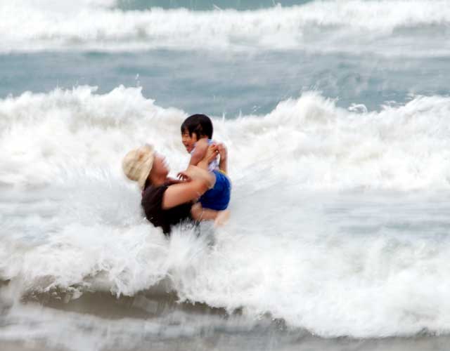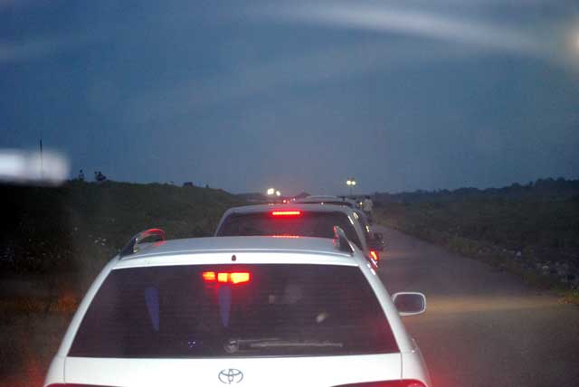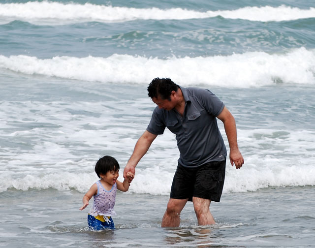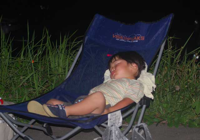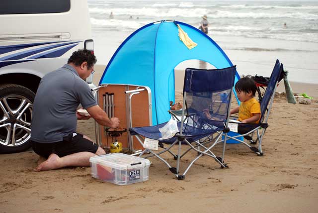 早朝、渚ドライブウエイ入り口に行く。 入り口には、通行禁止の表示とゲートが・・・一台のワゴン車が止まっている。 中には子供数人の姿が。多分海水浴に来たのだろう。 このまま帰る気はないので、とりあえず車を止めて外に出た。 砂浜を歩き海辺を歩く。水温はぬるく泳げそうな感じ。 台風5号の余波で多少波はある。しかし太平洋の荒波からすれば、小波のようなもの。 1時間くらい遊ぶ。 時折、地元の車がゲートを越えて渚ドライブウエイに入っていく。 見た限りは例年と同じ状況で車の走行は可能に見える。 地元の海水浴客と思われる車を入っていった。 9時ごろ、状況確認に来たと思われる車の人に声をかける。 「今日は、駄目なんですか?」 「大丈夫そうなので、もうゲートを開けます。どうぞ入ってください」 ドライブウエイに入り、適当な場所を探す。 子供がいるので、車の走行路よりも浜辺側で多少盛り上がっているところを探す。 波があるので、ヘタすると車まで波が押し寄せる可能性があるから。 まもなく、数台の車もやってきて、タープやテーブルセットを出し始めた。 我が家も準備開始。ワンタッチ式の丸屋根タープを設置する。 結構風があるのでしっかりとアンカーを打たないと飛ばされそう。 早速、海に入るが少し肌寒い感じ。Tシャツのまま遊ぶことにした。 ハヤトも海水浴用オムツ!?に交換。 波をまったく恐れず平気で遊び始めた。 勿論そばについているが、手を放して波遊びをさせる。 波が引くたびに足もとの砂が引かれて足が沈んでいく感じが不思議らしい。 ずっと立っている。 時々大きな波が来てひっくり返され、全身ずぶぬれ。少しは、海水を飲んだようで変な顔してしょっぱいみたいなことを言っている。 私と女房も水着に着替え本格的に遊ぶことにした。 10時ごろ・・・海水浴客は、数百人程度になって少し賑やかになってきた。 太陽はまったく顔を出さない。 多少雲行きも怪しいが、30度程度の気温もあるので大丈夫な限り遊ぶことにした。 熱い砂浜に転がって甲羅干しが無理なのが残念。 お昼は、焼肉パーティー。わざわざ持ってきた小型の厚手の焼肉プレートの出番。 風が強くてガスバーナーの火が飛ばされてしまう。急遽テーブルを風除けににして調理開始。 ご飯は面倒なので、カップヌードルにすることにした。 結構美味しい! 3人で2パック分の肉を完食。 15時、風が強くなりさすがに寒くなってきた。撤収することにした。 砂だらけで冷えた体を暖めることにした。 お馴染みの近所にる日帰り天然温泉「宝の湯」に入る。 ハヤトは疲れ切って爆睡状態。 炎天下の車の中には放置できないので、夫婦交代でゆっくり風呂に入ることにした。 最後にハヤトを起こして、私が温泉に連れていった。 ここの温泉は湯船に段差があり、急に深くなっていることを忘れていた。 ハヤトが広い温泉の中を歩いていたら急に沈んだ!? ビックリしたようだけど、特にバタバタしなかったのでひょいと持ち上げて救った。 普段から、頭からざーざーとお湯をかけて洗ったり、お風呂で泳ぐ真似をさせていた効能かな。 無事温泉終了。この間にコインランドリーでここ数日分の洗濯も終了。 これからの予定を検討する。事前調査係りの女房から報告。 金沢の少し先の能美市付近の川北町の大花火大会があるとのこと。 8時半から約1時間、12000発の予定。 北陸自動車道を使えば1時間をかからずに行ける。さっそく移動開始。 夕食はおにぎり等で軽く済ませることにした。 会場というかシャトルバス乗り換え場に車を置くことにしたが、河川敷の広場が駐車場。 そこまでが大渋滞。 何とか開始時間前に車を留められた。 そこから会場までは、数kmあるらしい。既にハヤトは熟睡状態。 花火会場近くに行くのは諦め、川の堤防道路に椅子を持ち出してゆっくりと眺めることにした。 さすがに遠いが雰囲気を堪能。 警備の警察官に聞いたら、普通に出たら12時ごろになってしまうよだって。 花火大会が終わる前にさっさと脱出。 北陸道で今夜の宿泊地? 小矢部SAへ向かう。 |