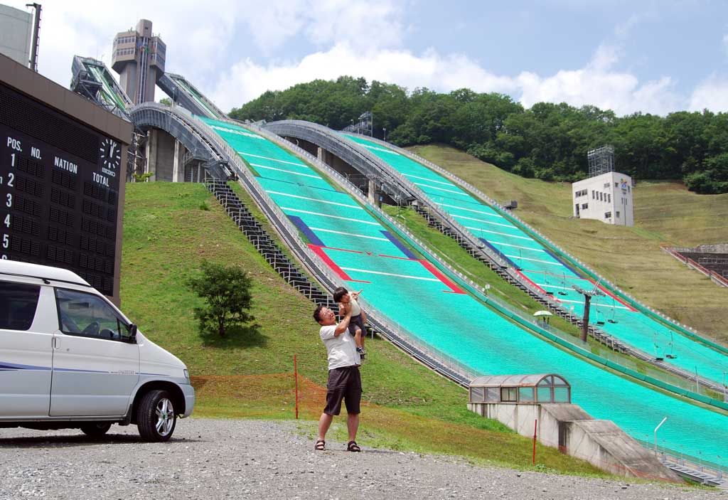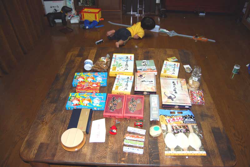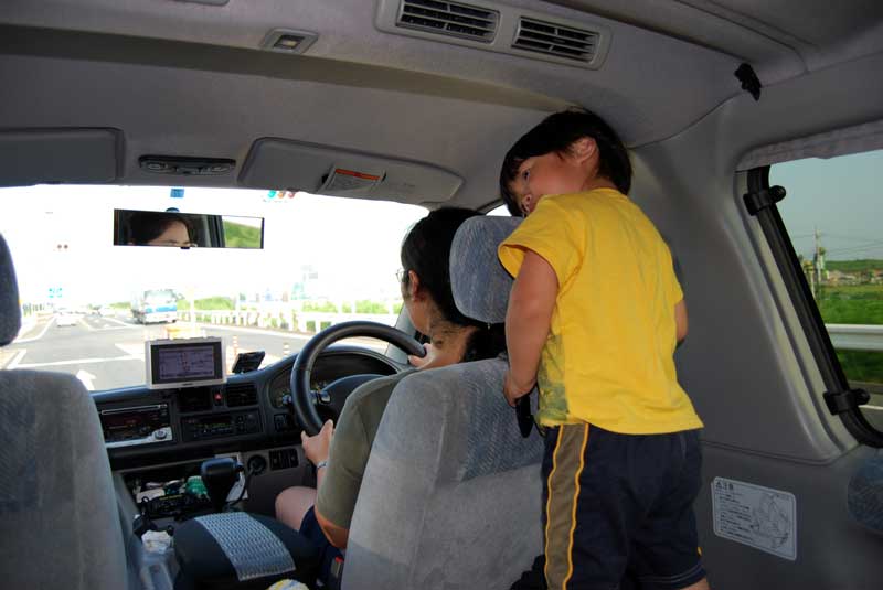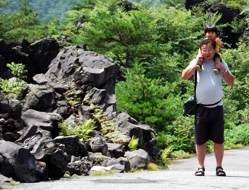 もう一回能登に戻って泳ぎたいな・・とふと思う。 豪華すぎる朝食を楽しみ一風呂浴びて 万座温泉「万座亭」を出発 志賀高原を後にして万座ハイウエイを南下する。 途中、嬬恋牧場で一休み ハヤトは、遊具遊びでストレス?発散 大津から軽井沢方面へ 交差点で偶然にカラフルな電車を見たハヤトは大喜び! 浅間山の鬼押出しを見物する。人がいっぱい・・・ 岩手山の焼け走りと同じ溶岩流と思ったがまるで雰囲気が違った。 岩手山は、一面コークスという感じ こちらは大きな岩がゴロゴロという感じ 岩の切断(割れ)面や特異な形状から噴火によるものと感じられる。 案内道路や神社等の造作があまりに人工的過ぎて自然の荒々しさが減じている。 こういうのは、好きじゃない。多分、もう来ないな。 運動不足のハヤトを歩かせて・・・ 親が先に進みハヤトが叫びながら追いかけていたのだが・・・ どこかのオバサン二人 「あらカワイそうに。いじめみたい。最近の親は・・」だって ウルセエ ババア! と叫びたい気持ちに 子供は歩くのが仕事なんだ。 とか思いつつ、 疲れきったハヤトを肩車で運ぶ私がいました(笑) ここから白糸の滝経由で軽井沢中心部に向かうことになるが、 休日なので人ごみ予感。 北軽井沢経由で国道18号線に乗ることにした。 安中、高崎、前橋と進み国道50号線へ。 ここから女房と運転交代 私は、後部座席ドロドロしながらハヤトと遊ぶことに。 さすがにハヤトも飽きてきた様子。 運転席の後ろにへばりついてじっと前を見ている。 18:30帰宅 恒例により買ってきたお土産を並べてパチリ ハヤトは真っ先に電車模型へ。 線路を組み立ててごろんと横になって遊び始めた。 しばらくしたらそのまま、オネンネ状態。 やはり疲れていたのでしょう。 とりあえずの無事帰宅でした。 延べ走行距離 1,485km