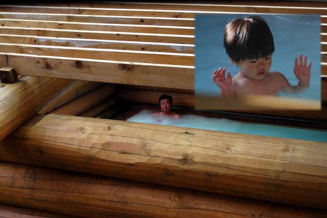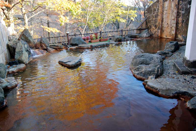 家から100kmほどの場所にある甲子温泉のみやま荘という宿に二部屋が格安で空いているのを見つけ、即予約。 私の両親を連れ出し、息子・女房の5人で久しぶりに親孝行をしてきました。 宿の好意もあり、とても良い部屋が二つ利用できました。 特に足腰の弱った両親達には、温泉に一番近い部屋を回してもらい感謝でした。 昨日は、あいにくの雨だったのですが、気にせずに広い露天風呂をほとんど貸切状態で堪能。 到着直後、夕食前、夕食後、深夜、朝、出発前と目いっぱい温泉三昧してきました。 ここは、広い露天風呂がウリで、泉質は硫酸塩に鉄分が混ざっています。 源泉も薄黄色なのですが、空気に触れる露天風呂は赤茶色になっています。 宿の人は、黄金湯(こがねゆ)と言っていたのですが、その黄金湯を実際に体験しました。 朝7時前の露天風呂。 朝日と共に湯面に映る紅葉が混じって、本当に黄金色でした。気持ちまでゴージャスになって朝風呂を楽しんでしまいました。