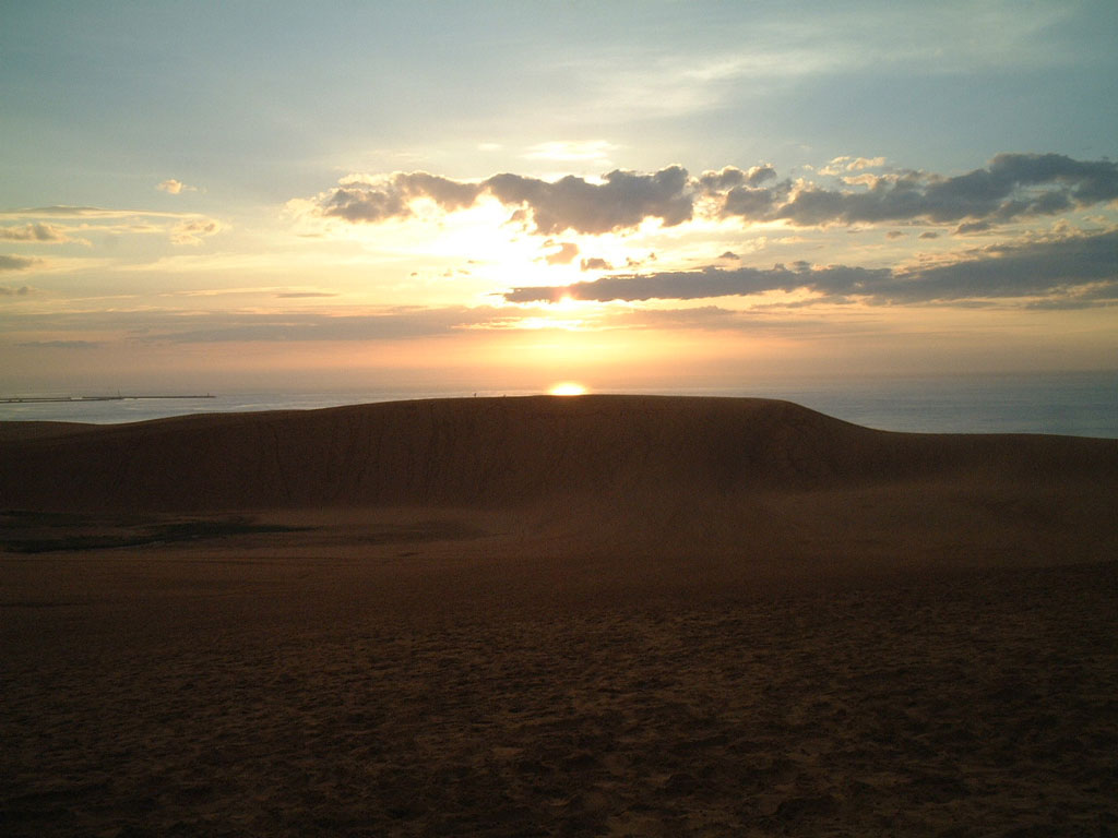 部屋からは、太平洋の水平線を見ることもできます。 なのに・・・最近の私の旅のほとんどが日本海側ばかり。ここ7,8年はそんな傾向にあります。 理由は、簡単。私は日本海に沈む夕陽を見るのが好きだからです。それだけ。 日本海側をドライブしている時は、今日の夕陽はどこで見よう。いつも意識して走っています。 私の見た夕陽を幾つか紹介していきます。 最初は、鳥取砂丘の夕陽です。 砂丘のシルエットの美しさに時が立つのを忘れてずっと・・まだ日が高いうちから・・ずっと見ていました。 ここは、もう一度、必ずもう一度行きたい場所です。