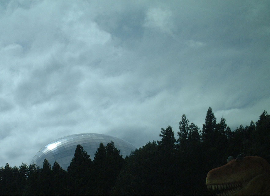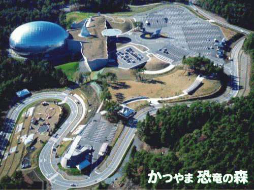 「かつやま恐竜のもり」から写した「福井県立恐竜博物館」です。 この連続写真は、勝山恐竜のもりのHPから借用しました。 恐竜博物館の詳しい説明は、こちらをご覧になってください。 卵型ドームの内部の広さには圧倒されます。 写真には、ドームの左奥の一部が写っていますが、壁面の絵や照明も雰囲気満点です。 映画「ジュラシックパーク」を髣髴させるような場所もあり、子供だけではなく(子供よりも!)大人が楽しめる素晴らしい施設です。入場料も500円と安いのも魅力の一つです。 息子が大きくなったら連れて行きたいところの一つです。