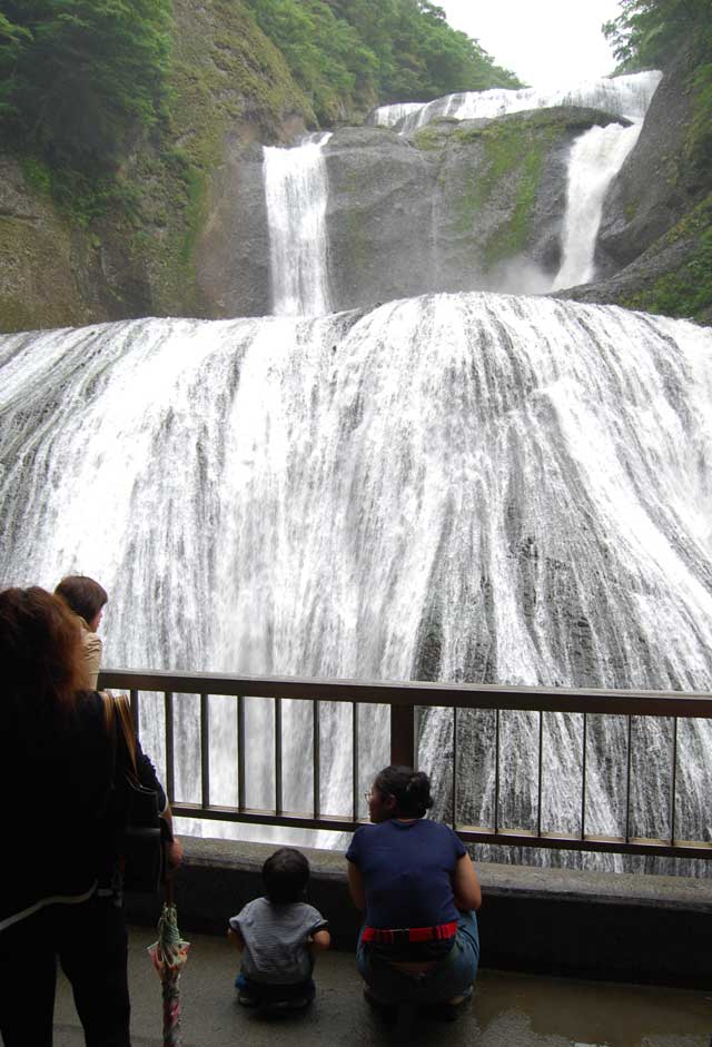 最初は、お魚市場。ここで地元のお魚を食し、その後に袋田の滝へ。 日本三大瀑布の一つとも言われている大きな滝です。 4回にわけて落ちてくることから四度の滝とも言われています。 少し前に雨が降っていたこともあって結構な水量でした。背中を向けてみているのは、女房と息子です。 物凄い轟音と微動だにしない周りの岩山や木々。 大きな流れの中に静けさも感じました。