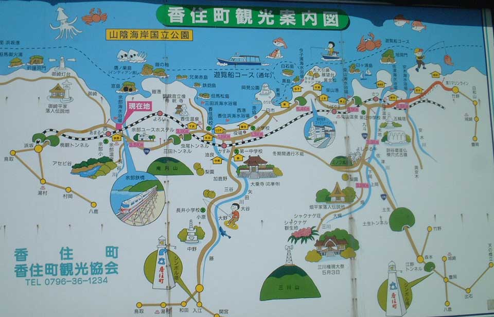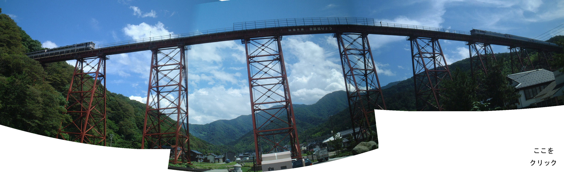 トレッスル橋というタイプとしては国内最大と言われていますが、私の思い出の中ではとにかく日本一の鉄橋なのです。 今から30年前・・・ 東京から松江に向かう夜行列車「出雲」で何度となくこの有名な橋を通りました。 この橋を通る時は、かならず下を見てやろうと思いつつも睡魔に負けてしまい、夜中の橋の下を見ることができませんでした。 そんなこともあり、わざわざこの鉄橋を昼間に見に行った時の写真が、今回公開するものです。 連続写真を強引につなぎ合わせたパノラマ写真も公開しておきます。 同じ線路の上を同じ列車が続いて走っています(笑) 餘部鉄橋、正式には、写真からも読めますが、「余部橋りょう」というようです。 この橋についてもっと知りたい方は、下からご覧になってください。 餘部鉄橋とは(1) 餘部鉄橋とは(2)