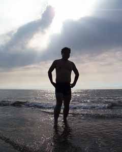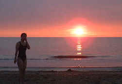 夕暮れ時。 Tバックの彼女は、何時の間にかやってきた彼と波間で抱擁&チュ・・・・ まあ、絵になる風景?