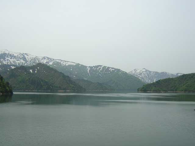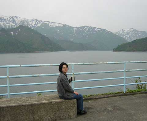 翌朝、田子倉ダムの上です。 指差ししている場所で車中泊。 涼しいというよりは、寒さを感じる夜明けでした。